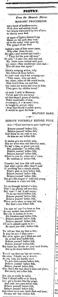 1827-06-15 Poetry. “Masonic Procession”; “Behave Yourself Before Folk” (Freedom’s Journal)