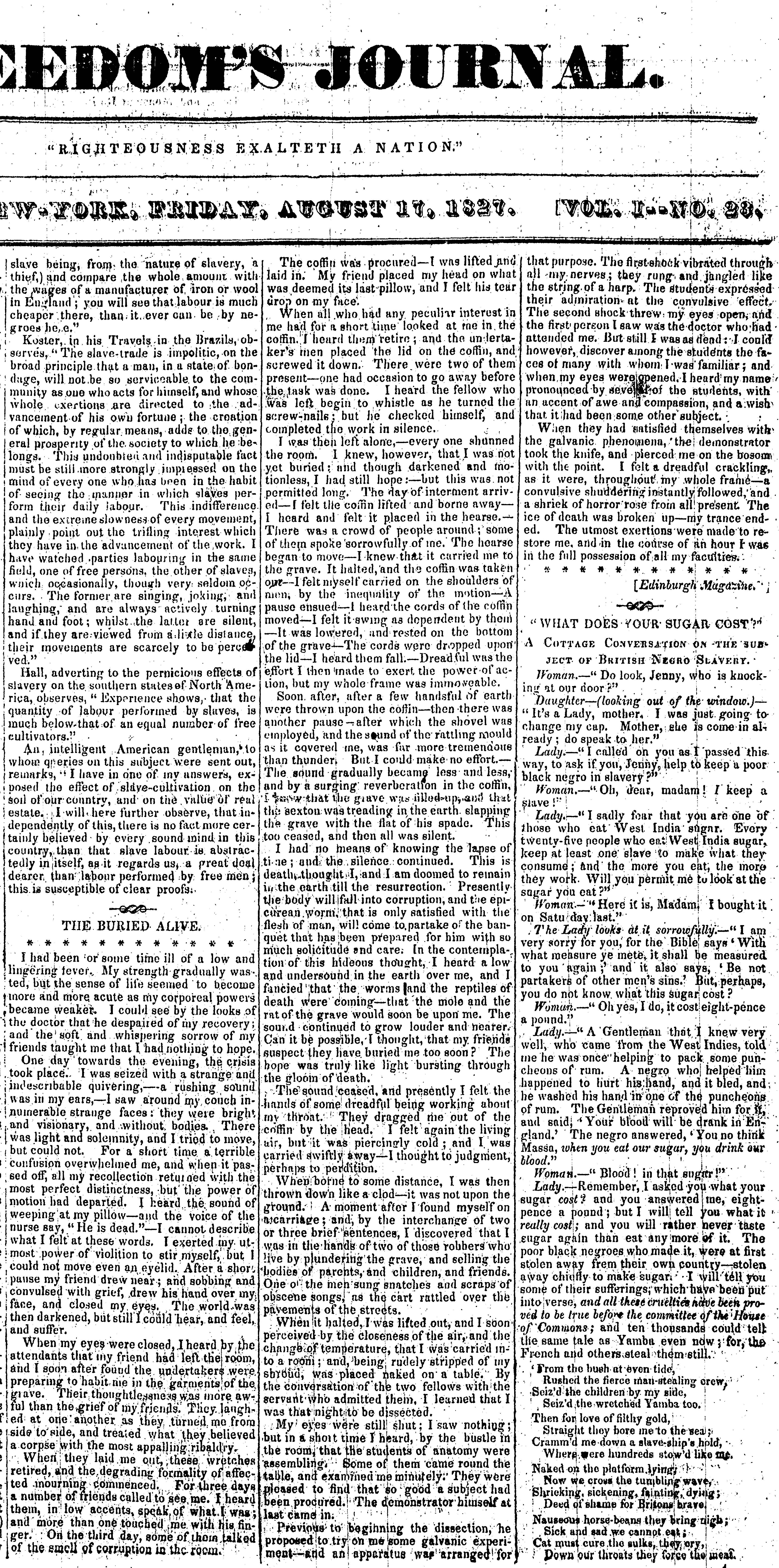 1827-08-17 Short Story. “What Does Your Sugar Cost?” [1/2] (Freedom’s Journal)