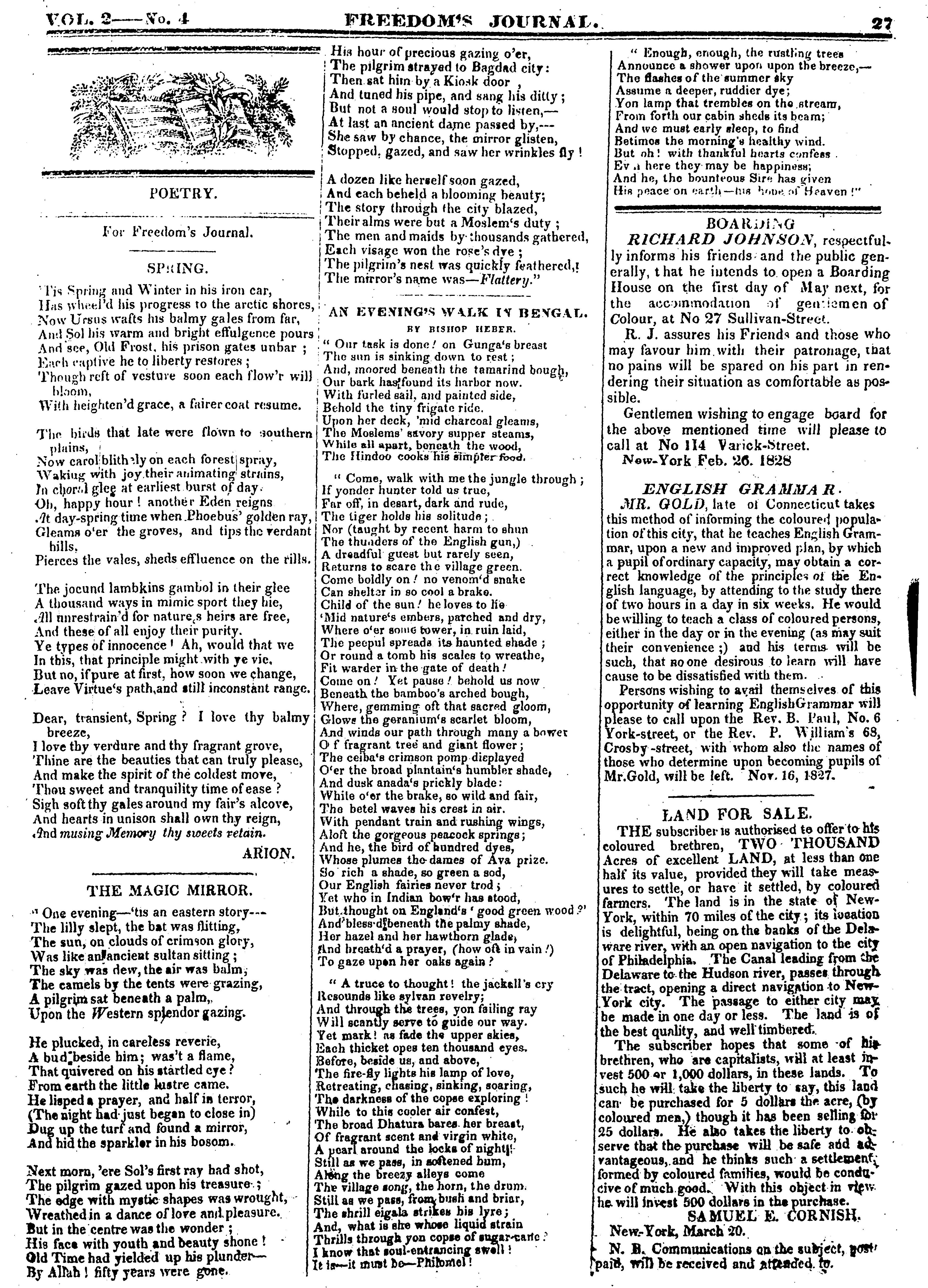 1828-04-18 Poem. “An Evening’s Walk in Bengal” (Freedom’s Journal)