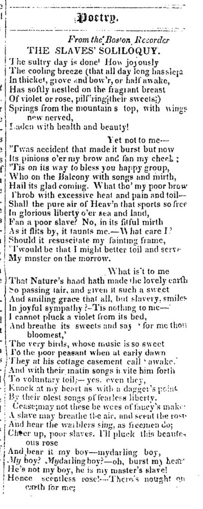 1828-11-21 Poem. “The Slave’s Soliloquy” (Freedom’s Journal)