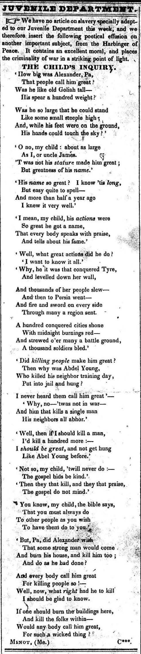 1831-02-26 Poem. “The Child’s Inquiry” (The Liberator)