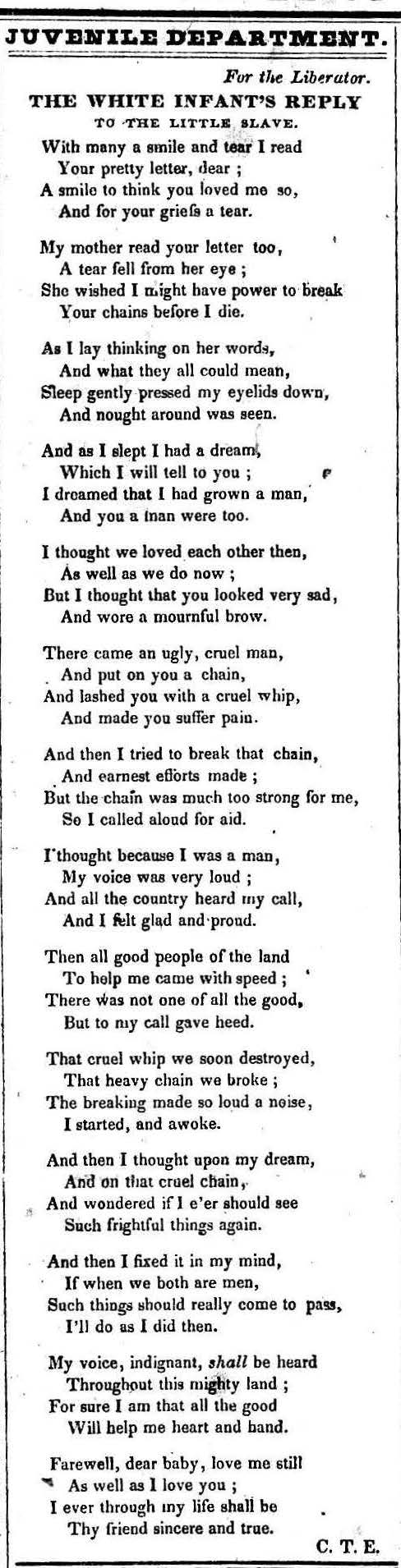 1831-03-26 Poem. “The White Infant’s Reply to the Little Slave” (The Liberator)