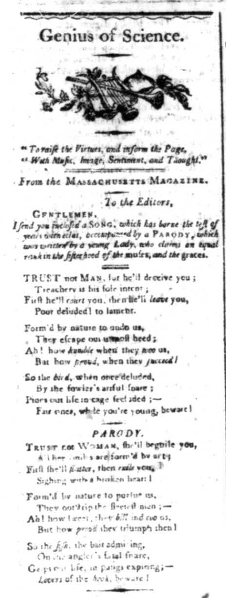 [Anon.], “Trust not woman, for she’ll beguile you” (Genius of Liberty, 7 Jun 1798)