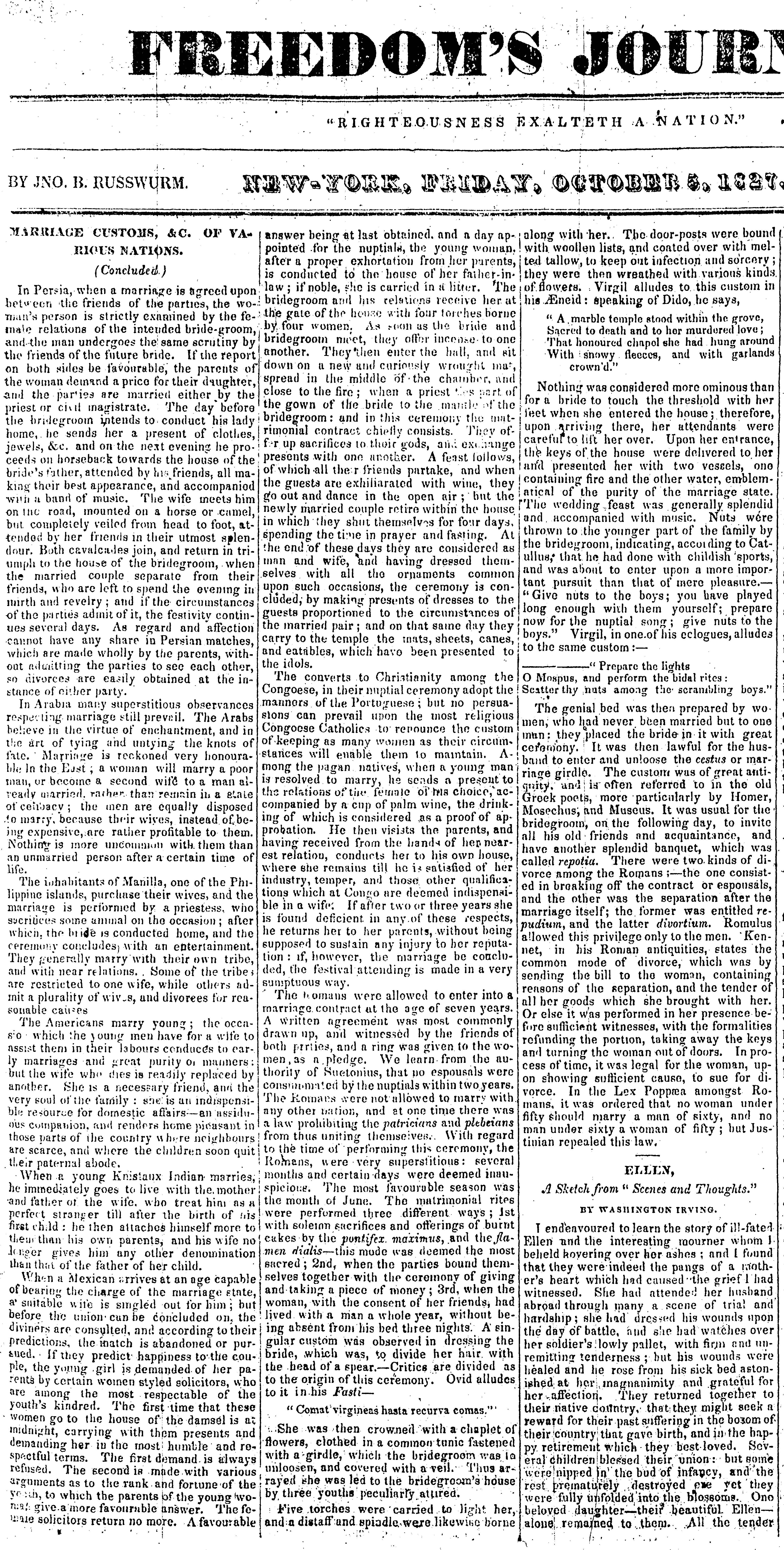 “Marriage Customs, &c. of Various Nations” [Part 3/3] (Freedom’s Journal)